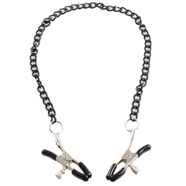 Feel the pinch of the Bondara Black Chain Nipple Clamps. Focus your attention on the two spots up top as you fix these rubber-tipped clamps around your nipples. Adjust the intensity as you use the screw to tighten or loosen the clamps and indulge in pleasurably painful stimulation.ย