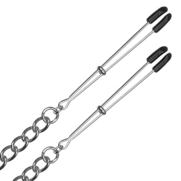 Indulge in nipple play during all manner of sexual play with these fantastic Chained Up Nipple Clips from Bondara. These silver metal slider clips are made of a two prong clip that has a sliding ring to tighten or loosen the pressure of the black rubber tips that hold your nipple firmly. These clips are easy and safe to use and can add a whole new element of stimulation into your sex life. Both clips are connected via a silver metal chain that works to weight the clamps slightly, for a more intense feel and an undeniably erotic appearance.ย